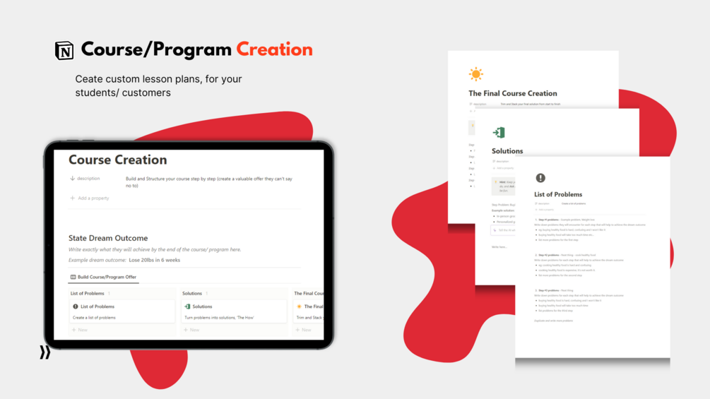 - A system to structure and build your course/ program Offer from start to finish in the most valuable way possible and to get the desired result for your student. (using Alex Hormozi's framework in building irresistible offers)
